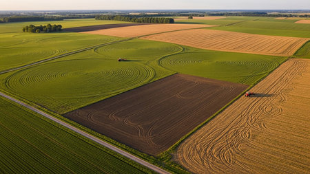 Aerial drone shot of crop rotation fields, highlighting efficient agricultural practices