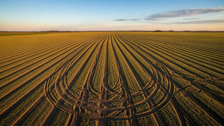 An aerial drone view of vast agricultural fields with perfectly aligned rows and circular tractor tire tracks under a clear blue sky at sunset.