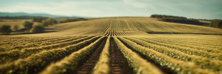 Farmland with neatly plowed rows stretching towards horizon, clear blue sky setting, highlighting vast expanse of agricultural potential, concept of farming, crop production, rural landscape.