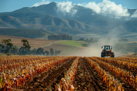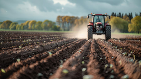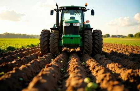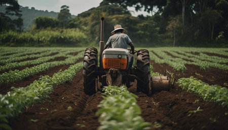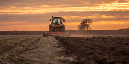 A farmer works a field on a tractor in a rural setting. The image showcases the essence of agriculture and the hard work involved in cultivating crops.