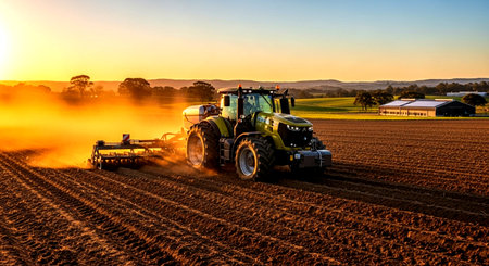 Tractor with seeder plowing a field at sunset in Australia
