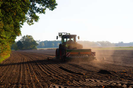 Farmer with tractor seeding - sowing crops at agricultural field. Plants, wheat.