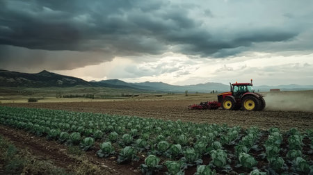 Tractor working in a cabbage field under a cloudy sky, showcasing modern farming techniques