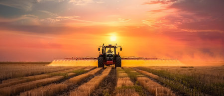 Tractor spraying crops with pesticides at sunrise in a colorful agricultural field.