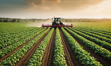 Tractor spraying pesticides over a green field