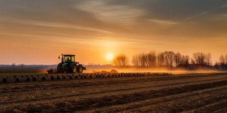 An AI generated illustration of a tractor working in a field at sunset