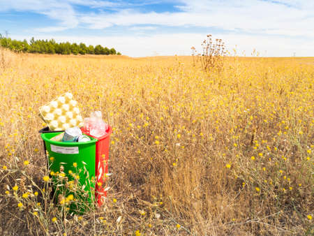 Three recycling cans one yellow the other green and the last one black full of cartoon plastic and aluminum recycling in a forest with yellow colors and one day with the blue sky
