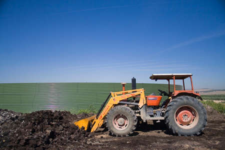 Tractor in a raft of alpech’n collecting compost near Jaen, Andalusia, Spain