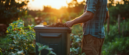 A farmer using compost bin to recycle organic waste, promoting sustainability and eco friendly practices in garden