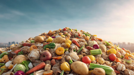 A large pile of organic food waste featuring diverse vegetables and fruits under a clear blue sky, highlighting issues of waste management and environmental sustainability.