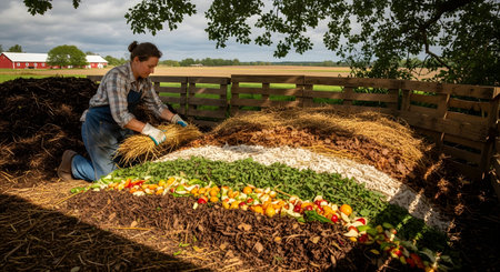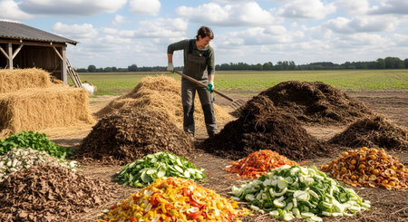 A woman works outdoors on a farm, using a pitchfork to manage large piles of organic compost. The mounds include straw, chopped vegetables, and dark soil, illustrating sustainable waste management.