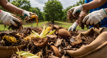 Close-up of composting process with food scraps and yard waste being mixed and decomposing into high-quality compost, showcasing effective waste management