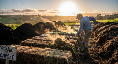 A farmer turns rows of steaming organic compost with a pitchfork during a golden sunrise. The scenic landscape features rolling green hills and a sign reading 'ORGANIC COMPOST,' highlighting sustainable farming and waste recycling practices.