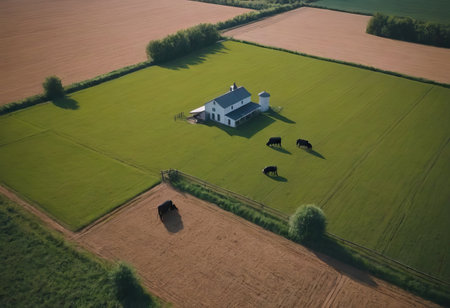 This image captures an aerial view of a picturesque farm that features several cows grazing peacefully on the lush green grass