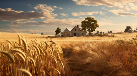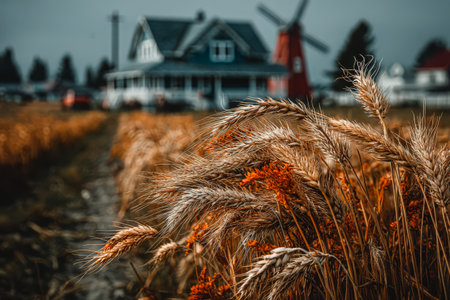 Wheat sways gently in a field with a rustic house and windmill in the background. The golden hues reflect the beauty of autumn creating a serene rural atmosphere.