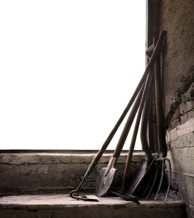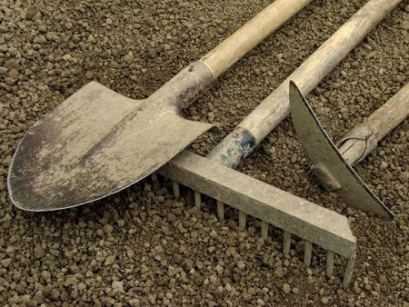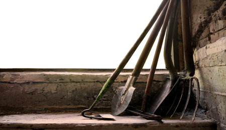Dirty used shovels and rake lean against a wall during the work break.