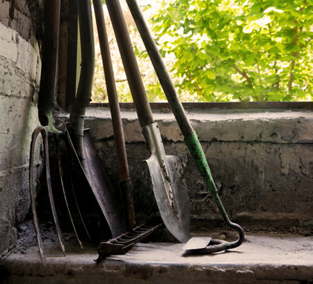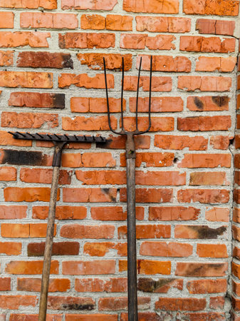 Garden Tools Against Brick Wall for Outdoor Maintenance