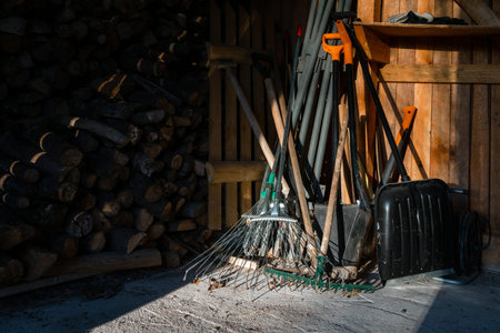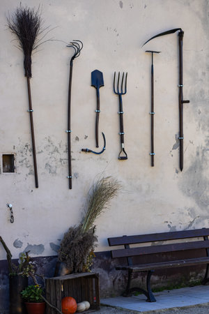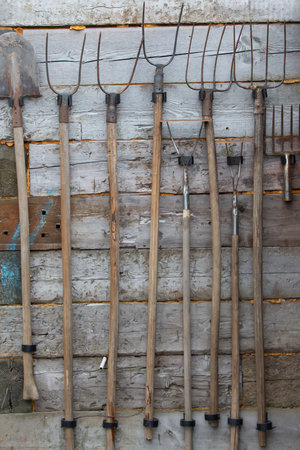 Gardening tools, shovel, rake and pitchfork stand against an old wooden barn wall, in a village courtyard. Copy space.