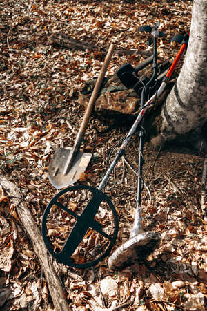 Metal detector device and spade on ground in forest