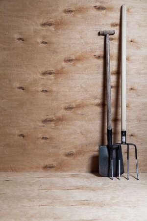 shovel and black metal pitchfork on a long wooden handle stand upright against a light plywood background
