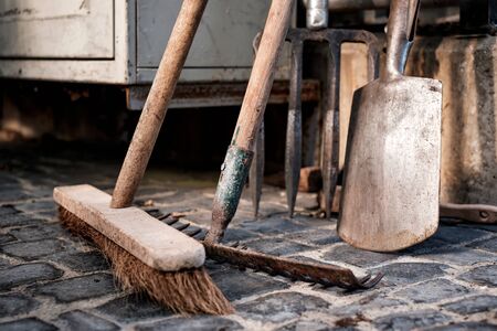Gardening equipment or Home care equipment. View on mop, broom, scoop close up.