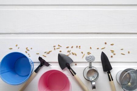 small gardening tools shovels and rakes buckets watering can seeds of various plants on a white background. copy space gardening vegetable garden floriculture planting plants summer season seedlings