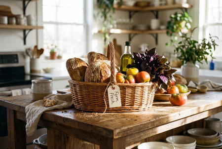 A woven wicker basket containing crusty artisanal sourdough bread loaves alongside a bottle of olive oil and fresh heirloom tomatoes sits on a distressed wooden island in a sunlit rustic kitchen.