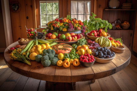 a stunning arrangement of fresh fruits and vegetables on a round wooden table, created with generative ai