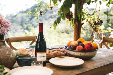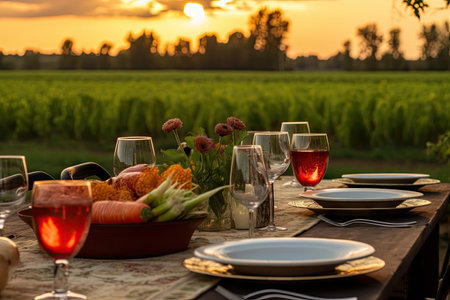 farm-to-table dinner with wine pairings, featuring produce and meat from the farm, created with generative ai
