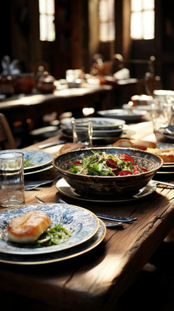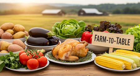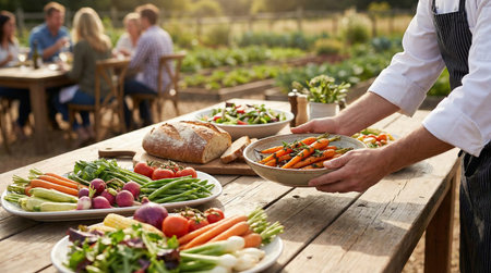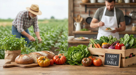 Rustic dining table with a farm-to-table spread, featuring fresh vegetables, artisanal bread, and a wooden serving platter