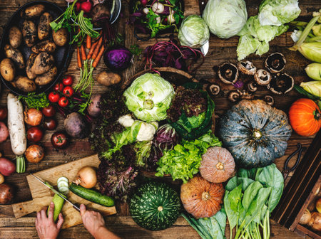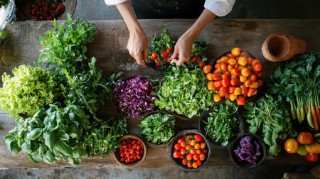 In a lively kitchen, a professional chef skillfully selects and arranges fresh vegetables on a rustic wooden table, showing vibrant colors and textures.