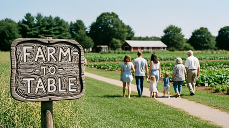 Organic farm-to-table dinner set in a rustic outdoor farm setting with lush fields, farmers harvesting fresh produce, and a long communal table