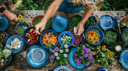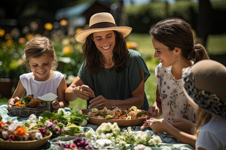 farm-to-table dinner party with friends, cooking and sharing fresh produce and herbs, created with generative ai