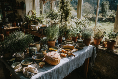 Rustic kitchen table with fresh herbs and bread in sunlit country cottage.