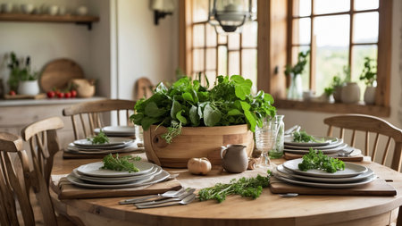 Rustic table setting with fresh herbs in a rustic kitchen.