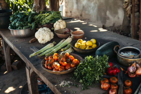 A picturesque rustic kitchen featuring a wooden table adorned with fresh vegetables, herbs, and simple pottery. The warm atmosphere is complemented by natural light streaming through the window, creating a perfect setting for culinary inspiration.