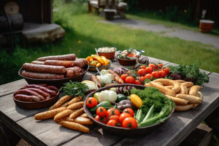 A tasty barbecue with sausages and vegetables created with generative AI technology