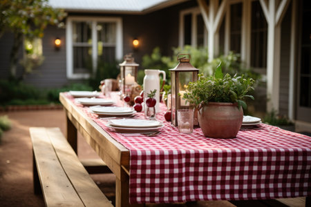 Table setting in the backyard of a country house with red and white tablecloth