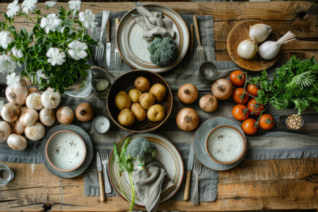 A beautifully arranged rustic table set with fresh vegetables, plates, and cutlery, ready for a wholesome meal.