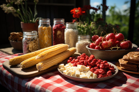 table with a red and white checkered tablecloth in a corn field on a summer day filled with snacks