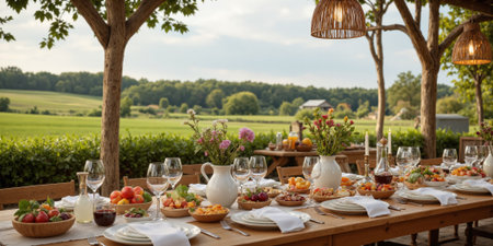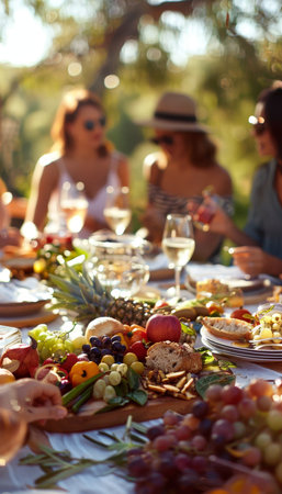 Experience a vibrant outdoor dining scene with a beautifully arranged table showcasing fresh salads, fruits, and gourmet dishes, perfect for gatherings.