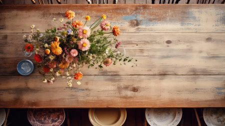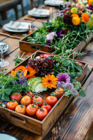 Vibrant floral arrangement featuring fresh fruits and vegetables is beautifully displayed on a rustic wooden dining table, creating an inviting atmosphere for a delightful meal experience