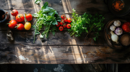 Local produce with lush greens and warm light set on rustic wood, ideal for farm-to-table, nature or healthy food visuals