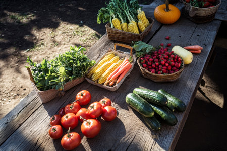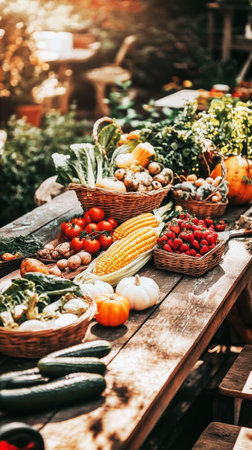 Freshly harvested local farm produce displayed on rustic wooden table, featuring vibrant vegetables and fruits, surrounded by lush greenery and warm sunlight, showcasing nature's bounty