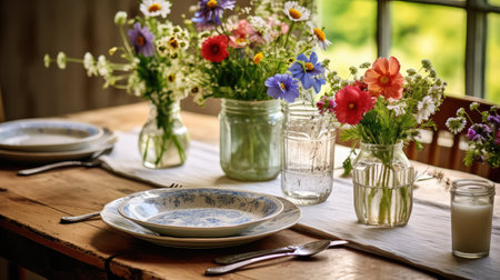 Charming rustic farmhouse dining table decorated with fresh lavender and garden flowers in kitchen