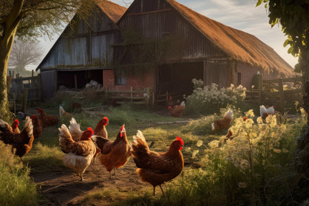 Chickens roaming in farmyard at sunrise with warm sunlight and farm buildings. That the image is generated using AI.