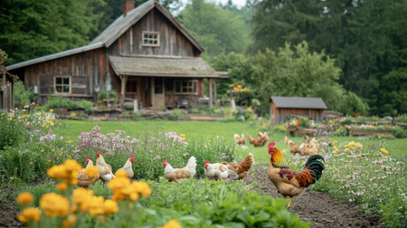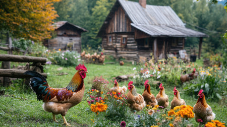 Chickens roam freely around a charming wooden farmyard while a vibrant rooster stands proudly in a lush, flower filled garden in early morning.
