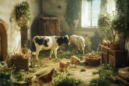 A tranquil farm atmosphere premium features cows and goats, enhanced by soft lighting and rich textures, creating an inviting and serene environment.
