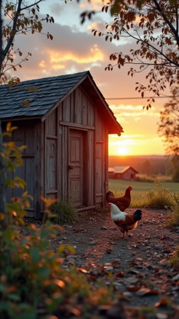 Rustic sunrise farm scene with chickens and wooden barn. That the image is generated using AI.