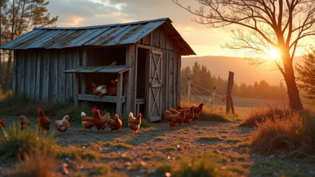 Rustic chicken coop at sunrise with free-range hens in a rural landscape. That the image is generated using AI.